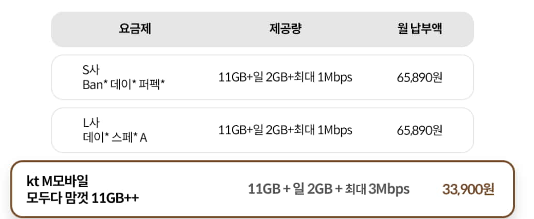 동일 제공량 대비 요금제가 이통 3사보다 훨씬 저렴합니다. (위 사진은 선약25% 제외금액) 이렇게 저렴할 수 있는 이유는, 알뜰폰은 통신망을 구축하는 구축 비용이 들지 않고, 오로지 임대 비용만 지불하기 때문에, 이통3사보다 훨씬 저렴한 금액으로 서비스 제공이 가능합니다.